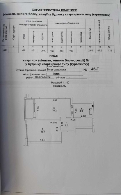 Загальна площа 47 м2, житлова 15 м2, кухня-вітальня 17 м2