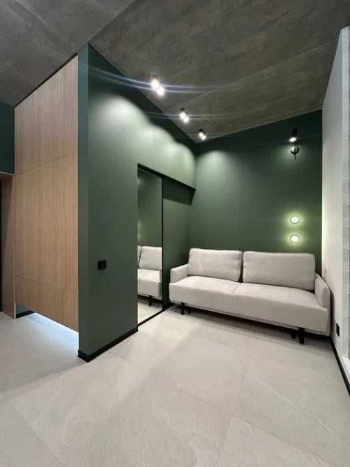 Зона відпочинку з розкладним диваном, великим гардеробом та телевізором.