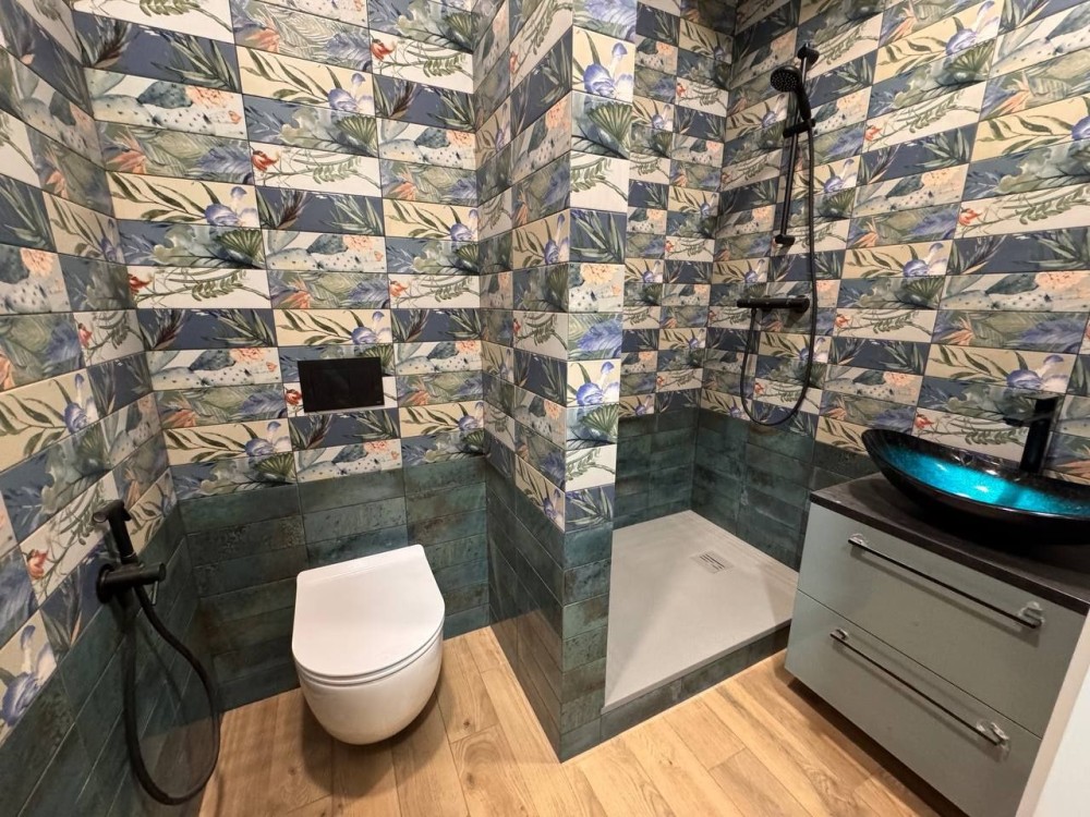 Ванна кімната та туалет повністю обладнані — нова сантехніка, біде, бойлер, сучасна плитка та якісне оздоблення. Є невелика гардеробна або місце для зберігання речей, виведено місце під кондиціонер, проведений інтернет-кабель, встановлені броньовані сталеві двері.