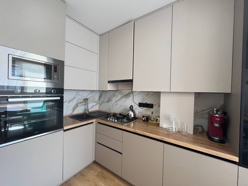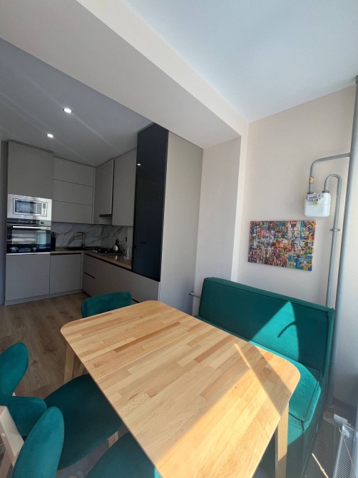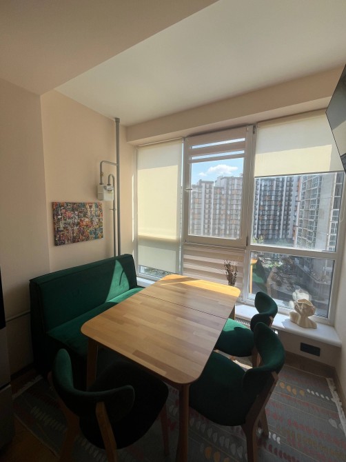 Кухня-вітальня з лоджією, вмонтовані меблі, обідній стіл, м’яка зона
