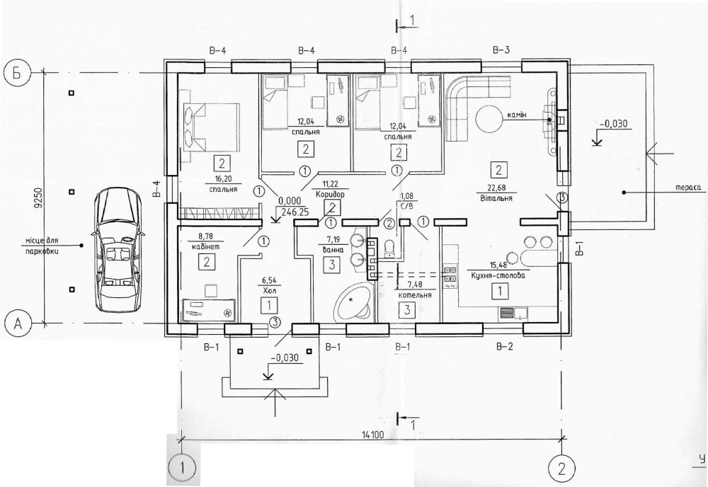 75000. Три спальні (16м² і 12м²), кухня об'єднана з вітальнею (15,5м² і 22,5м²,) кабінет (9м²), котельня (7,5м²), вітальня виходить на терасу.