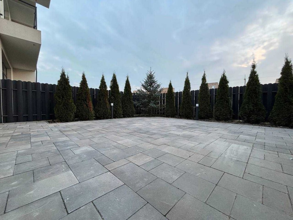 Двір: висаджені дорослі декоративні рослини, укладена бруківка.