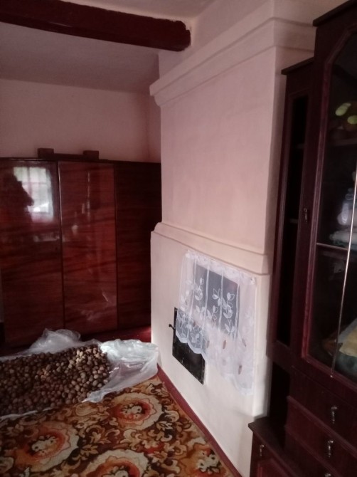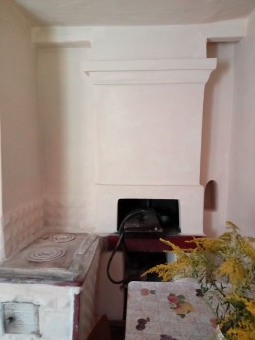 Площадь дома 43 кв.м, две комнаты и кухня, печное отопление, печка - красавица в перестенке между комнатами есть еще одна печь. Поямо в стене. . Побелка нежно- персиковый, ближе к бежевому