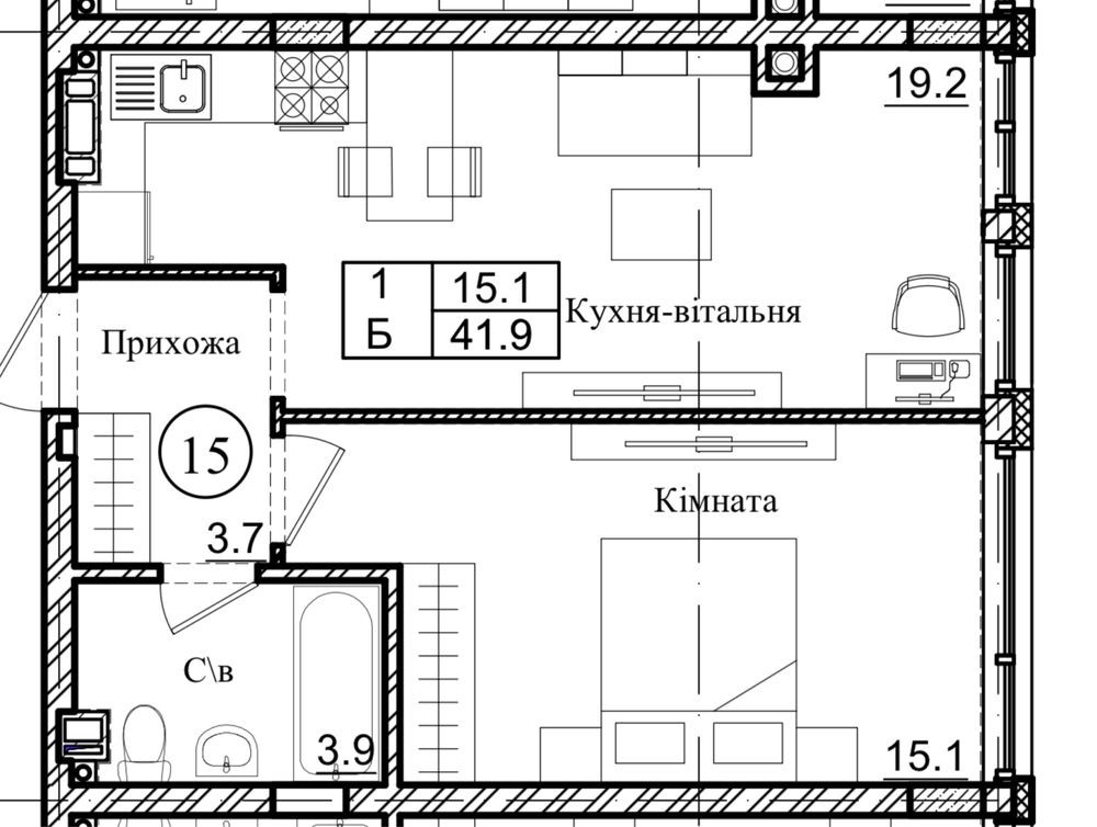 • Площа кухні 15 м2