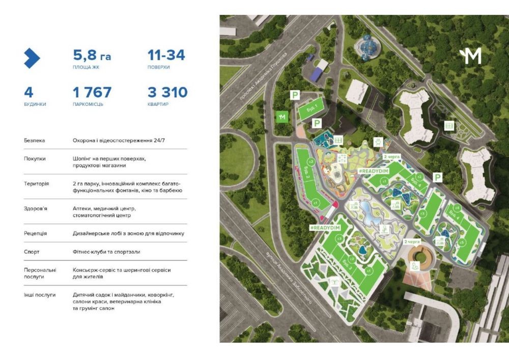 Сучасний комплекс із розвиненою інфраструктурою: підземний паркінг, бомбосховище, охорона 24/7, дитячі та спортивні майданчики, зелені зони, фонтани.