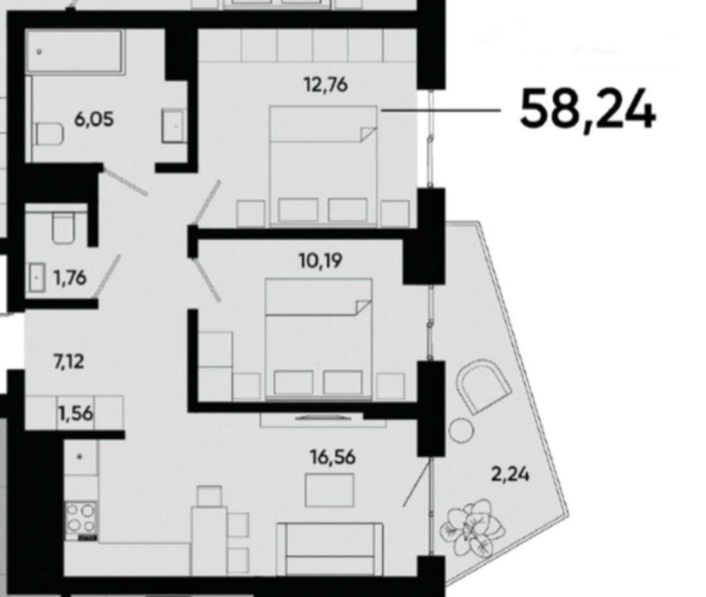 Заг. площа 58,24 м2, кухня 16,56 м2, велика тераса. 2 ізольовані спальні, роздільний санвузол.