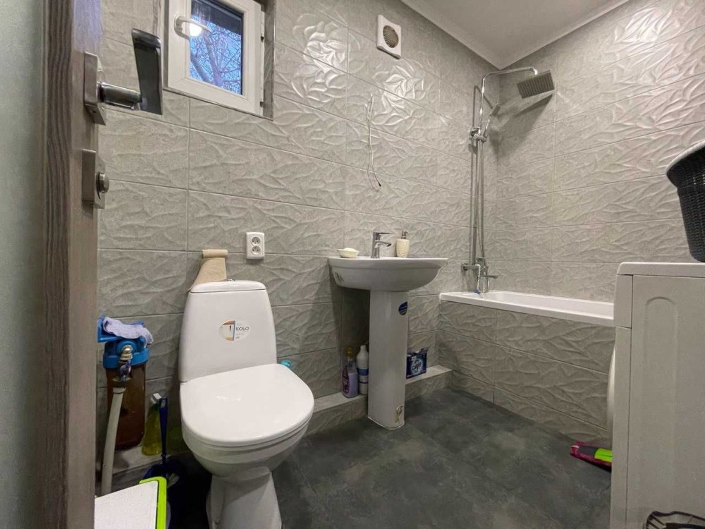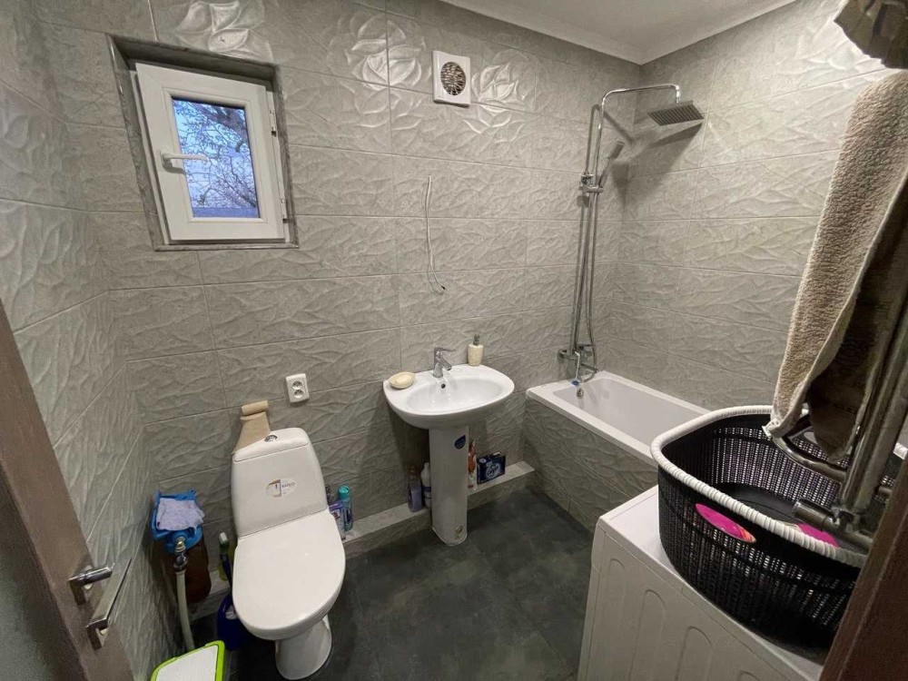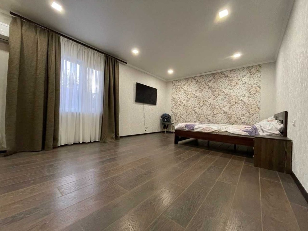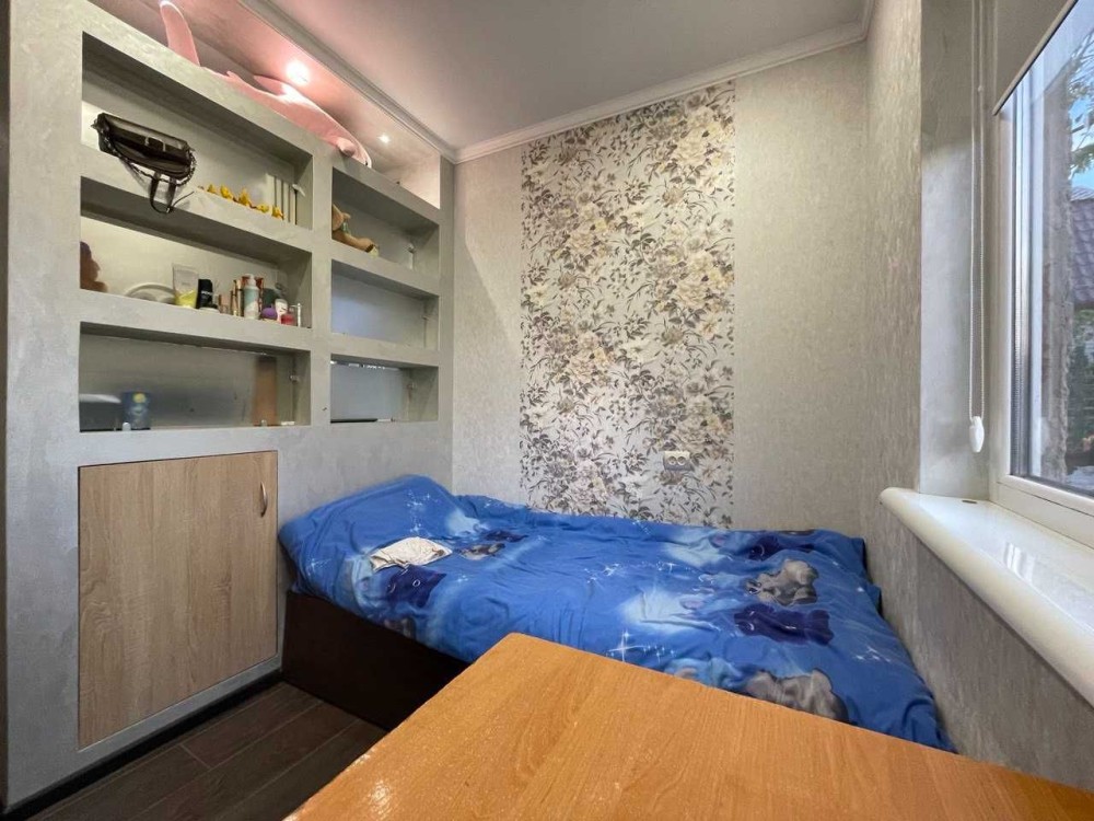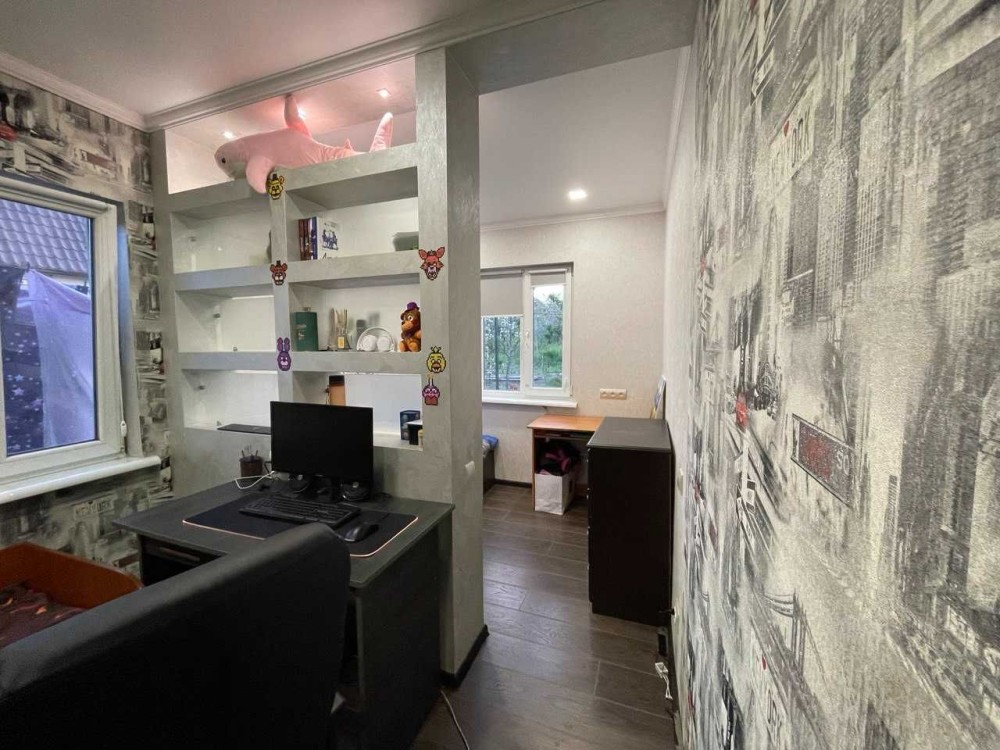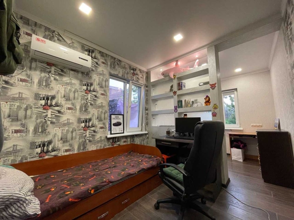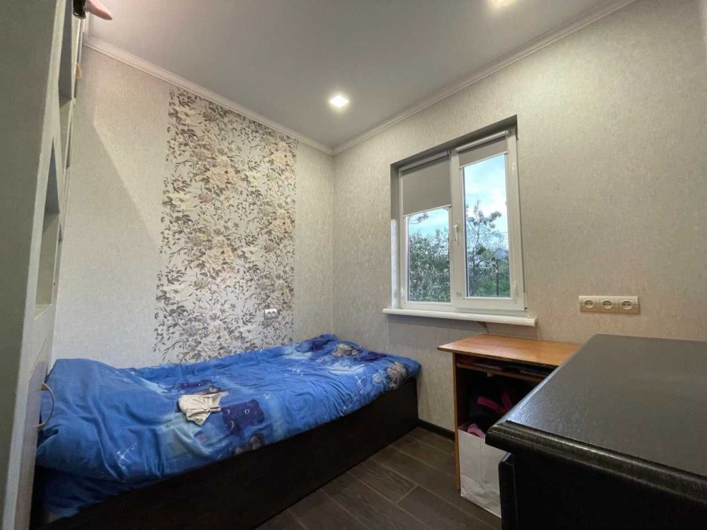 Дом построен из ракушняка,утеплен,шумоизолирован,крыша из металлочерепицы. 3 комнаты,из которых: 1 детская(разделенная дизайнерской перегородкой на 2 зоны),1 спальня и 1 проходная большая комната(используется под зал). Кухня,санузел,есть возможность сделать второй мансардный этаж(сделан пол,электрика). Установлены металлопластиковые окна,новые межкомнатные двери.