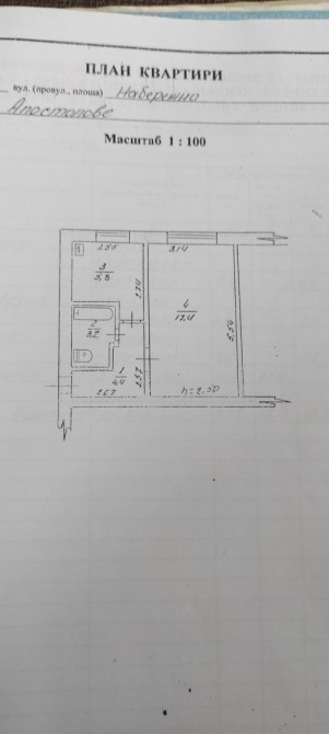Квартира майже в центрі м. Апостолове ( вул. Набережна ). Однокімнатна, без ремонту, без меблів . Є лічильники на газ,воду, е/е ( день/ніч). Перший поверх, пластикові вікна. Є газова плита і колонка ( по документам). Опалення немає