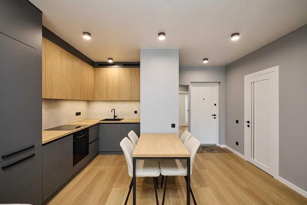 Підлога, кухня-вітальня - кварцвініл, ванна кімната керамічна плитка.