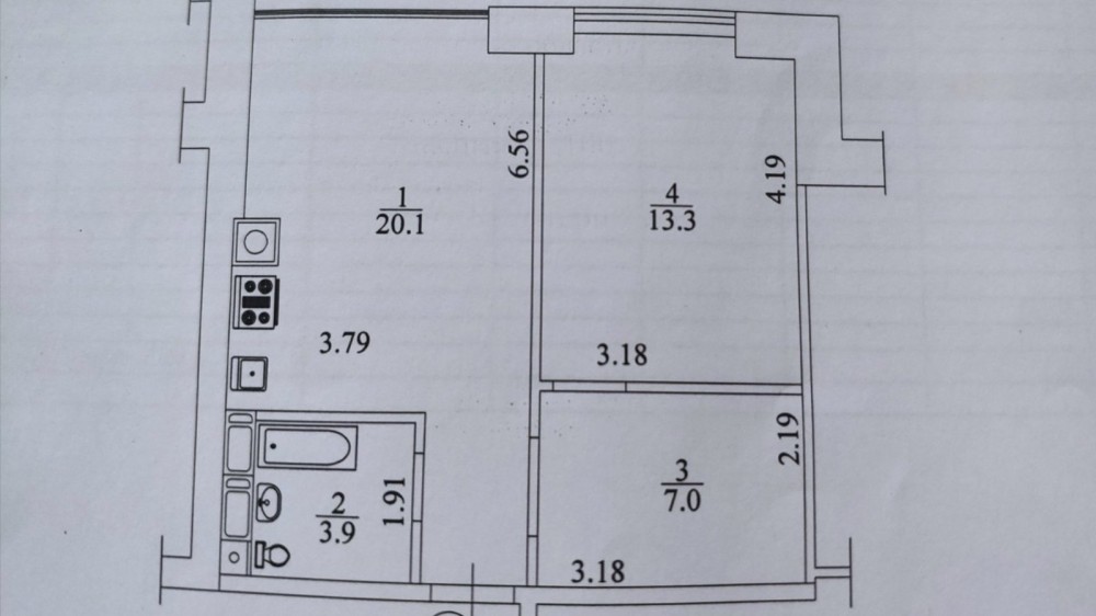 Загальною площею 44 кв.м., кухня 13 кв.м.