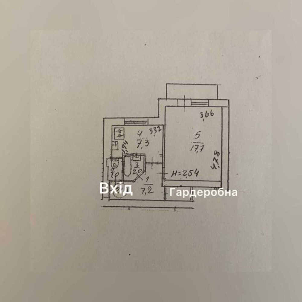 Квартира знаходиться на 7 поверсі, 9 поверхового будинку, загальною площею 36 кв.м, житловою 18 кв.м та кухнею 7 кв.м.