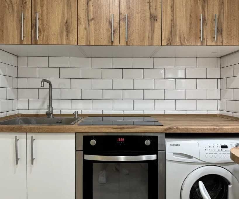 Кухня современная и просторная, полностью укомплектована техникой. Встроенная стиральная машина Samsung, холодильник Electrolux высотой 2 м, новая варочная поверхность, встроенная электрическая духовка. Установлена глубокая металлическая мойка с дозатором. Кухонная мебель полностью новая.