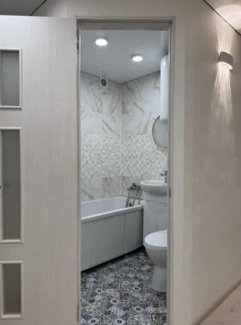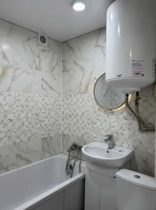 Ванная комната отделана новым кафелем по всем стенам. Установлена новая сантехника: ванна, умывальник, унитаз. Новый водонагреватель. Пластиковая разводка труб, счётчики воды. Зеркало с подсветкой и электрическая вытяжка на отдельном выключателе.