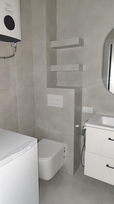 Санузел полностью укомплектован современной сантехникой: ванна, бойлер, раковина с тумбой, зеркало с подсветкой, унитаз с инсталляцией, стиральная машина.