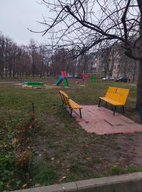 Детская площадка, парковочное место и гаражи рядом