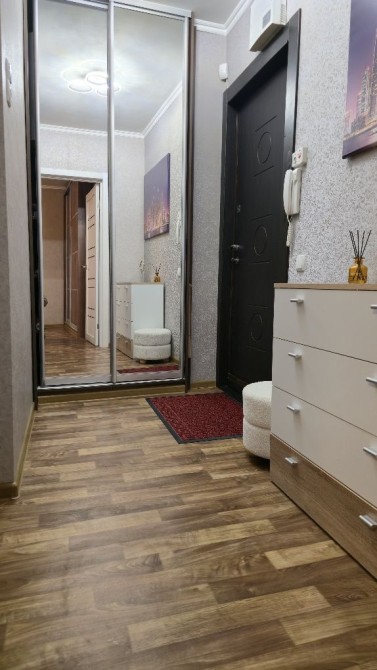 Бронированная   дверь, современная плитка, замена труб, МПО, большая комната встроенный на всю стену шкаф купе,  линолиум,  застеклен и обшит балкон,