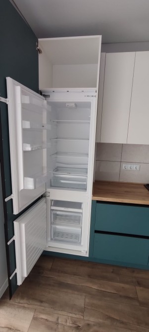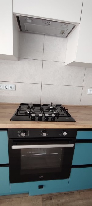 Вмонтована кухня, кухонні меблі - стіл, стільці, холодильник, варильна поверхня, духова шафа, посудомийна машина.