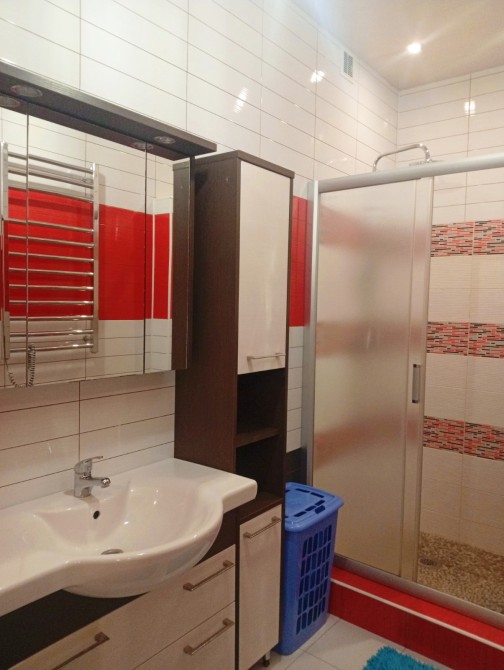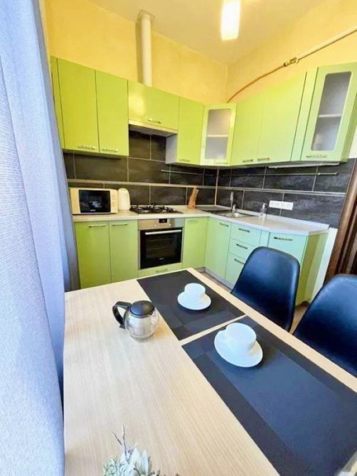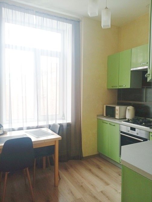 Квартира знаходиться на 4-му поверсі, має площу 45 м2. Дуже зручне функціональне планування, двостороння, висота стелі 3,2 м. Велика світла кімната 21,2 м2, з виходом на засклений балкон. В кімнаті є робоча зона зона, двоспальне ліжко, великий диван. Просторий коридор 10 м2, з вбудованими шафами і коморою. Кухня 6,5 м2, невеличка але затишна, з вікнами у двір, повністю укомплектована необхідною технікою. Санвузол суміщений, з душовою кабіною.