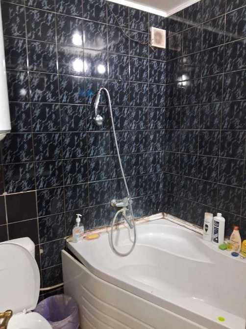 Санузел в кафеле , угловая ванная , бойлер.
