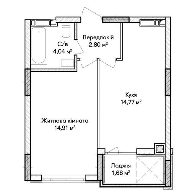 Житлова кімната 14,91 м² — світла, правильної форми, зручно зонувати під спальню та робочу зону.