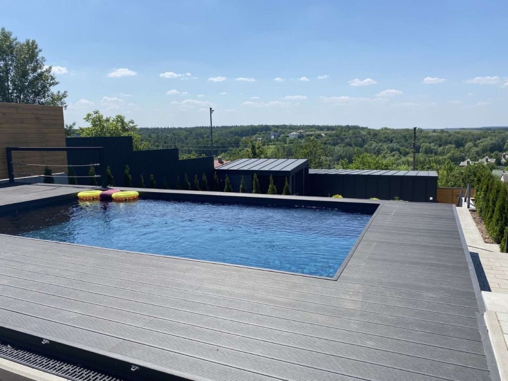 1-й будинок, 2-й поверх. 160м2 + 65м2 верхня і нижня тераса + басейн 20м2 + гараж на 3 авто 73м2+підсобне приміщення.
