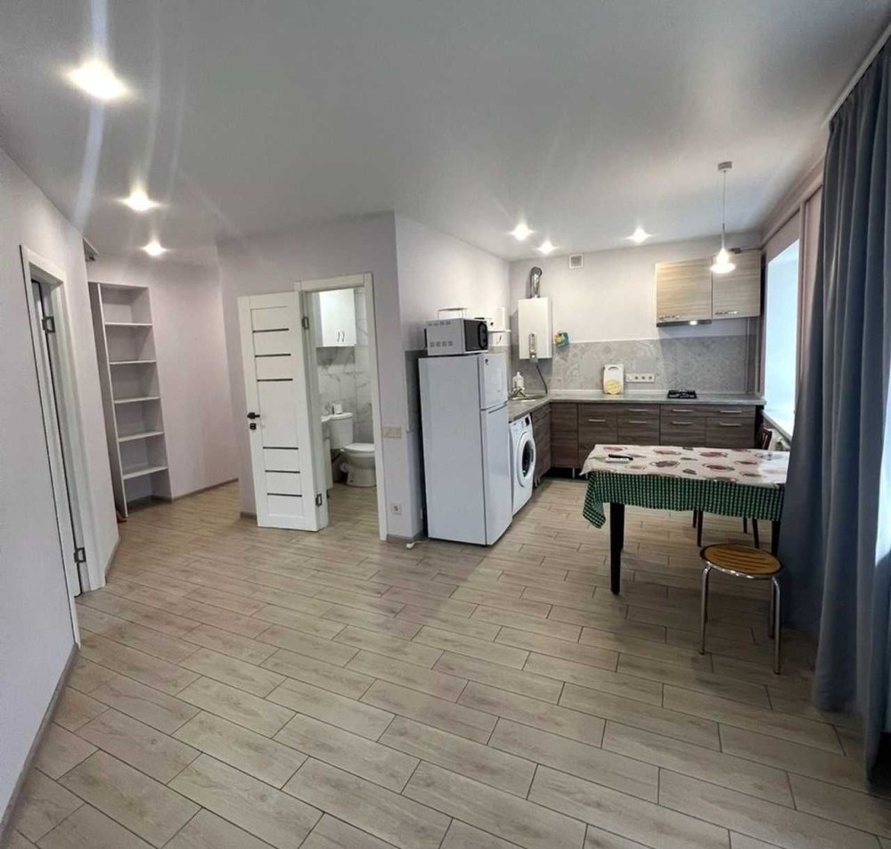 Площадь 46м2, спланирована как просторная кухня - гостиная (21м2) и отдельная уютная спальня.