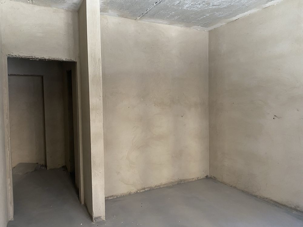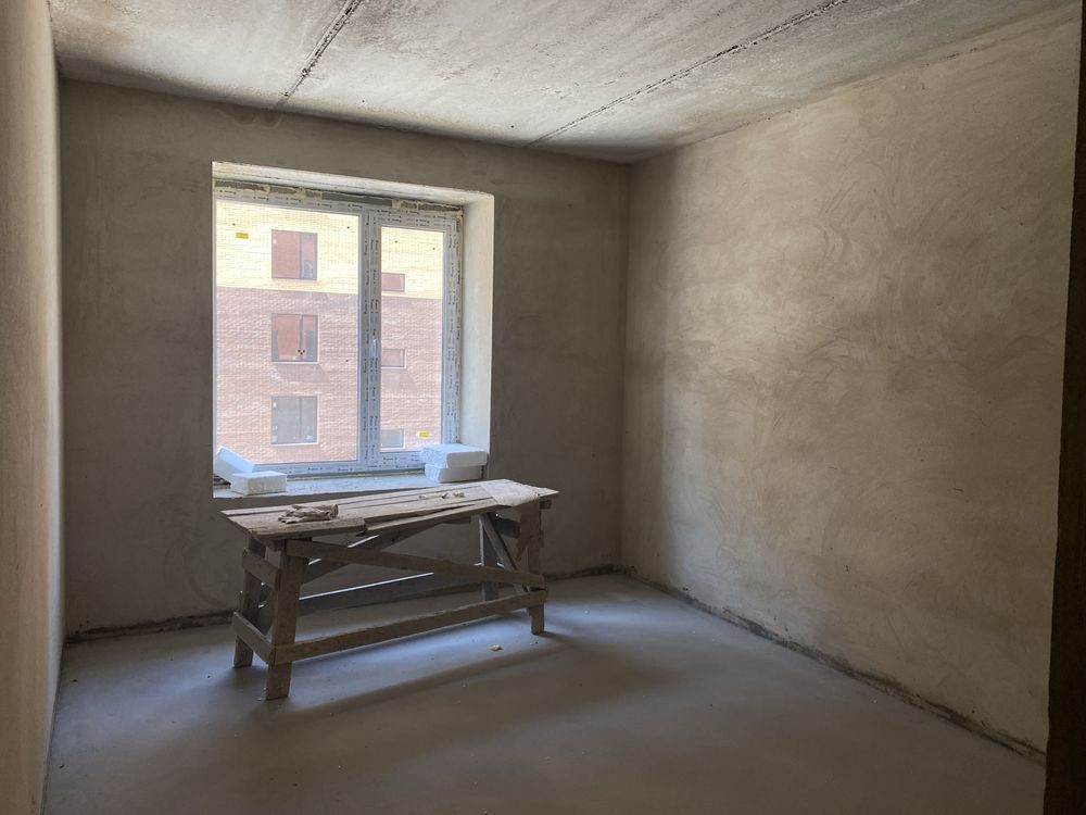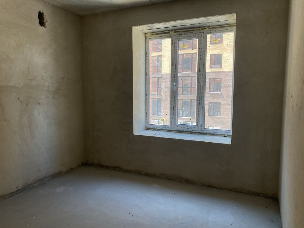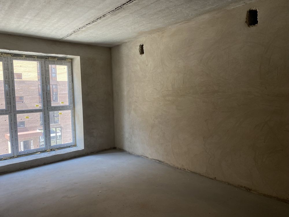 У квартиру заведені комунікації, зроблена стяжка на підлозі, вирівняні стіни (штукатурка), встановлені вхідні двері та склопакети.
