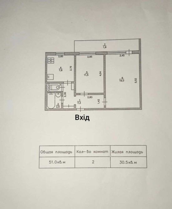 Загальна площа - 51 кв.м., житлова - 30,5 кв.м., квадратна кухня - 7,8 кв.м.