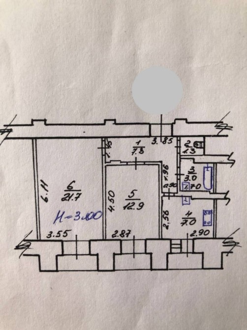 Общая площадь квартиры 60 м2, ж/б перекрытия, 3 балкона. Комнаты раздельные, кухня 7 м2, санузел раздельный. Высота потолков 3 м. В доме подключён газ.