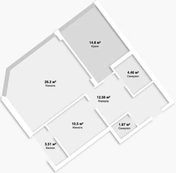 кухня 14,8 кв.м, 2 окремі кімнати, 1 балкон, 2 санвузли.