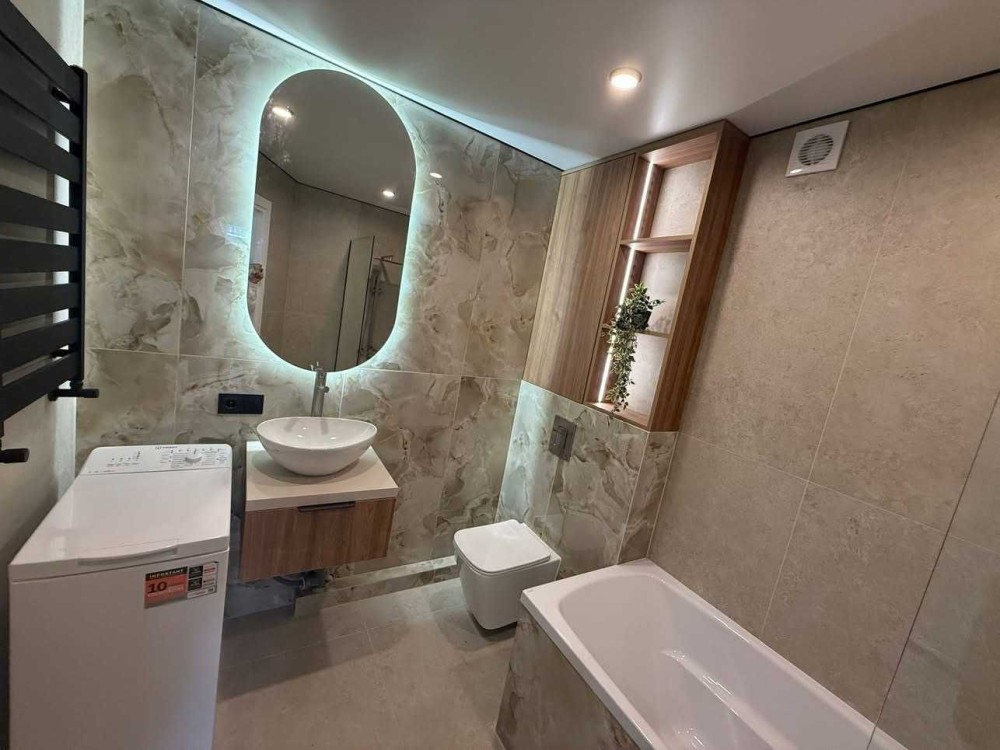 Ванна кімната із пральною машинкою.