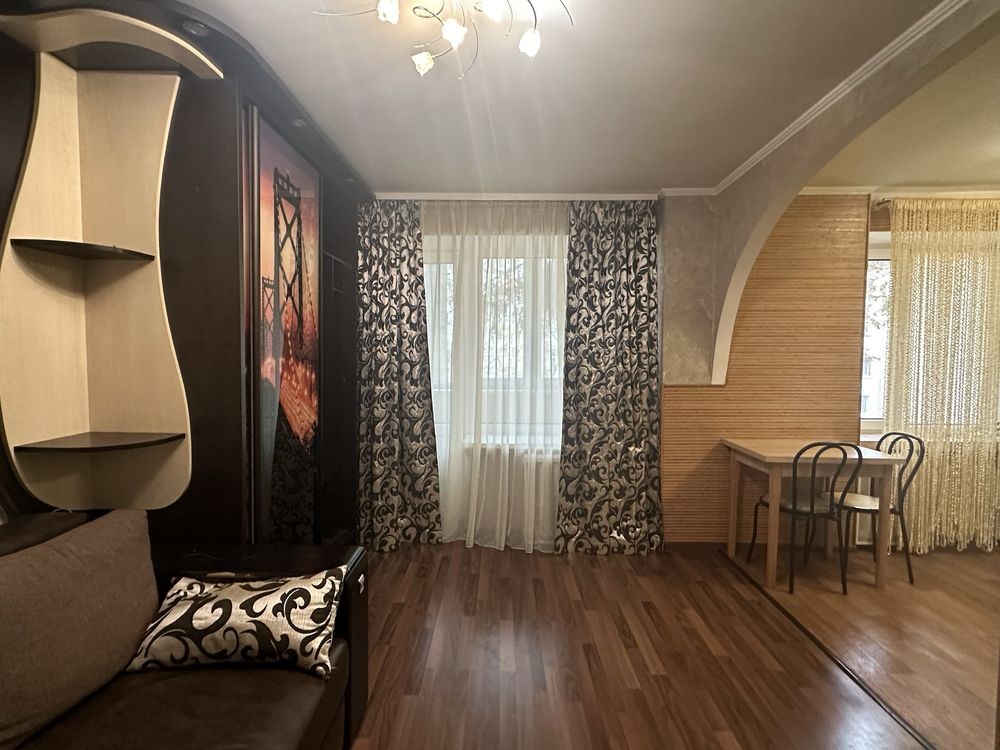 Квартира вільного планування, окремі спальня та кухня- вітальня, суміжний санвузол. Просторі кімнати.