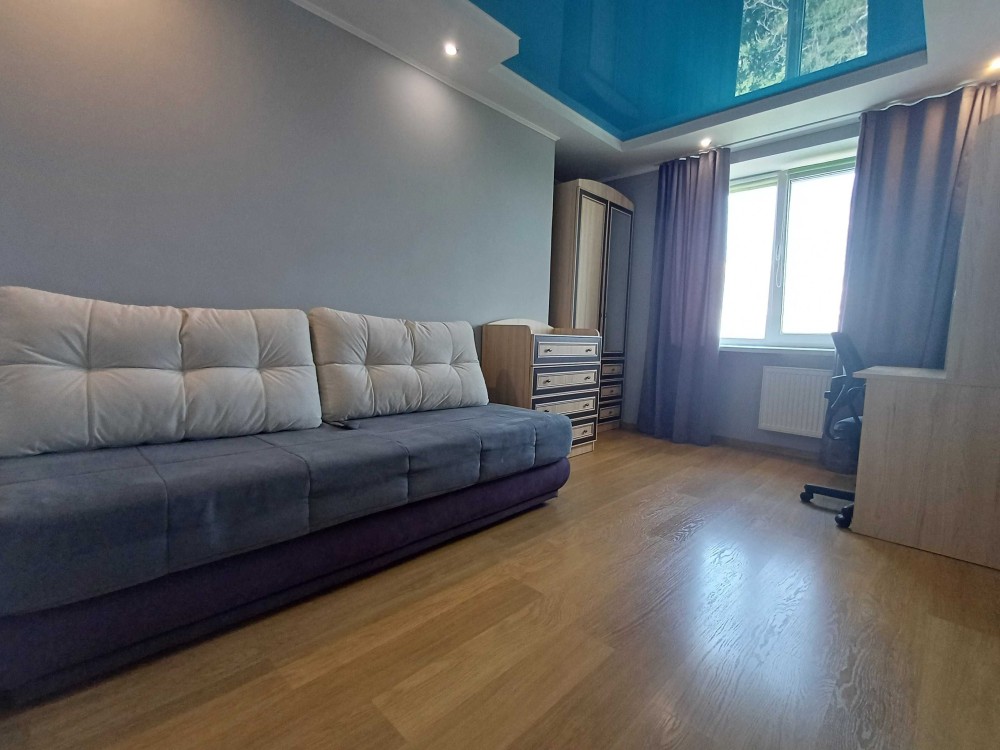+ натяжные потолки, металлопластиковые окна, на полу в комнатах - ламинат, в зоне прихожей, кухне и санузле - плитка