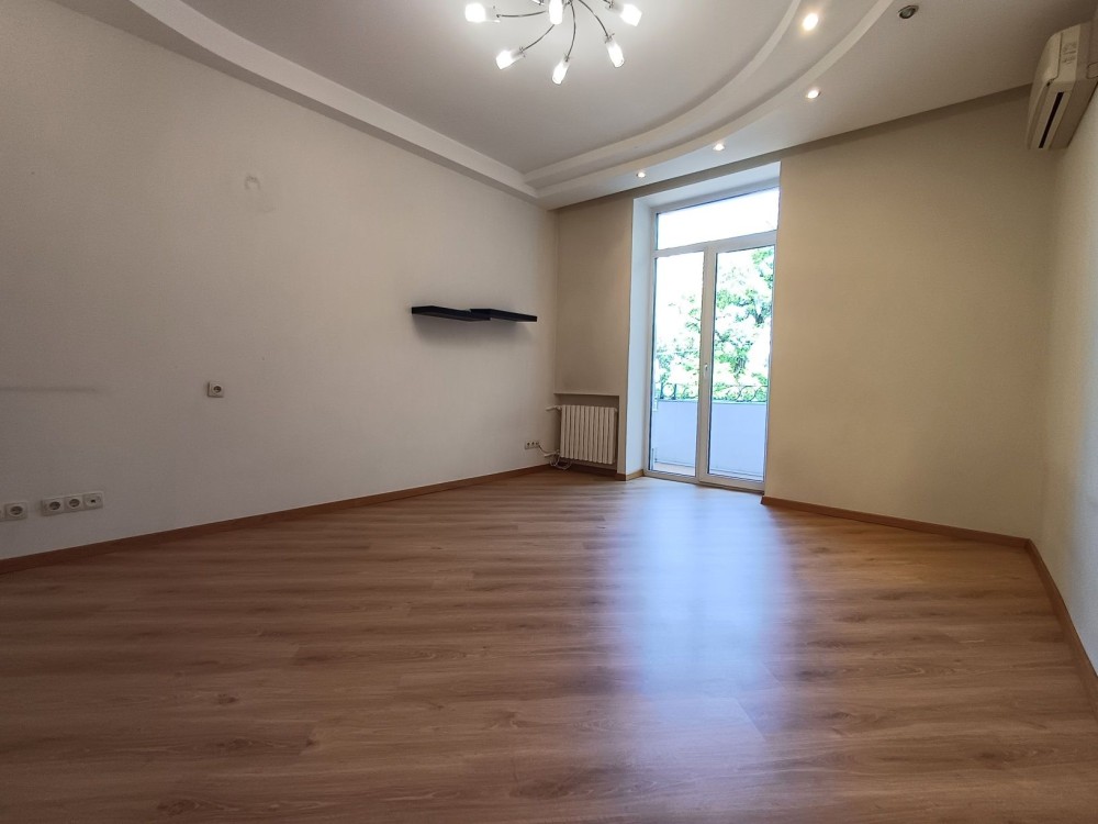 Квартира двухстороняя (кухня, гостиная и застекленный балкон выходят во двор, две спальни, одна из которых с открытым балконом, - на проспект Яворницкого), с/у - совмещен и увеличен.
