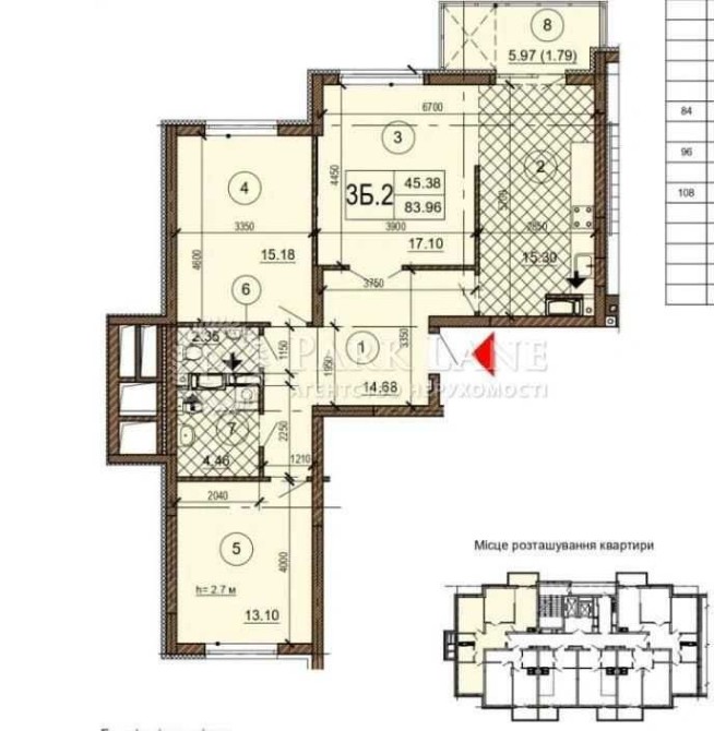 3 кімн. кв., 18/25 поверх, площа: 88/45,4/15,3 кв.м.