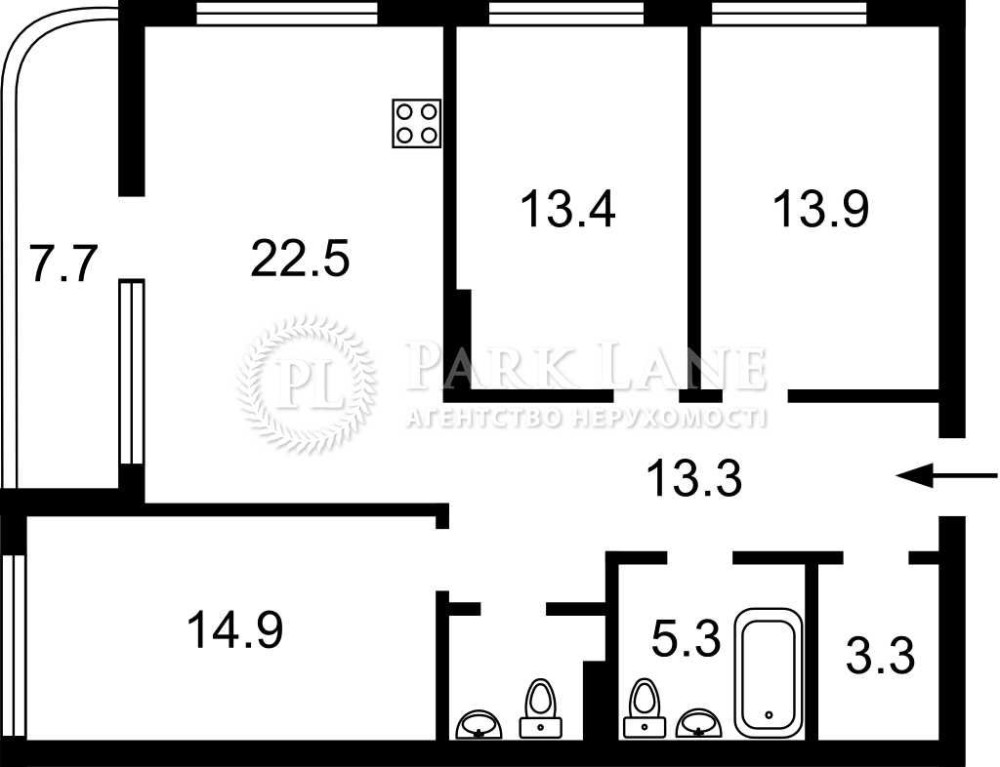 •Три окремі кімнати, які можуть бути спальнями (дитячою, кабінетом або гостьовою кімнатою);