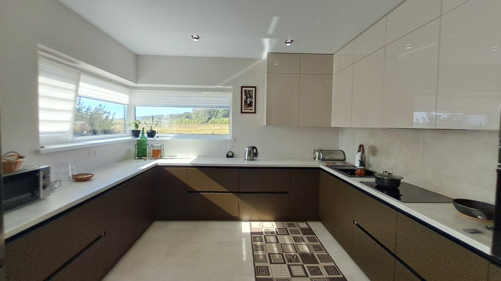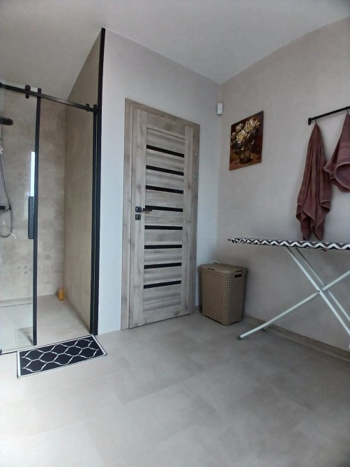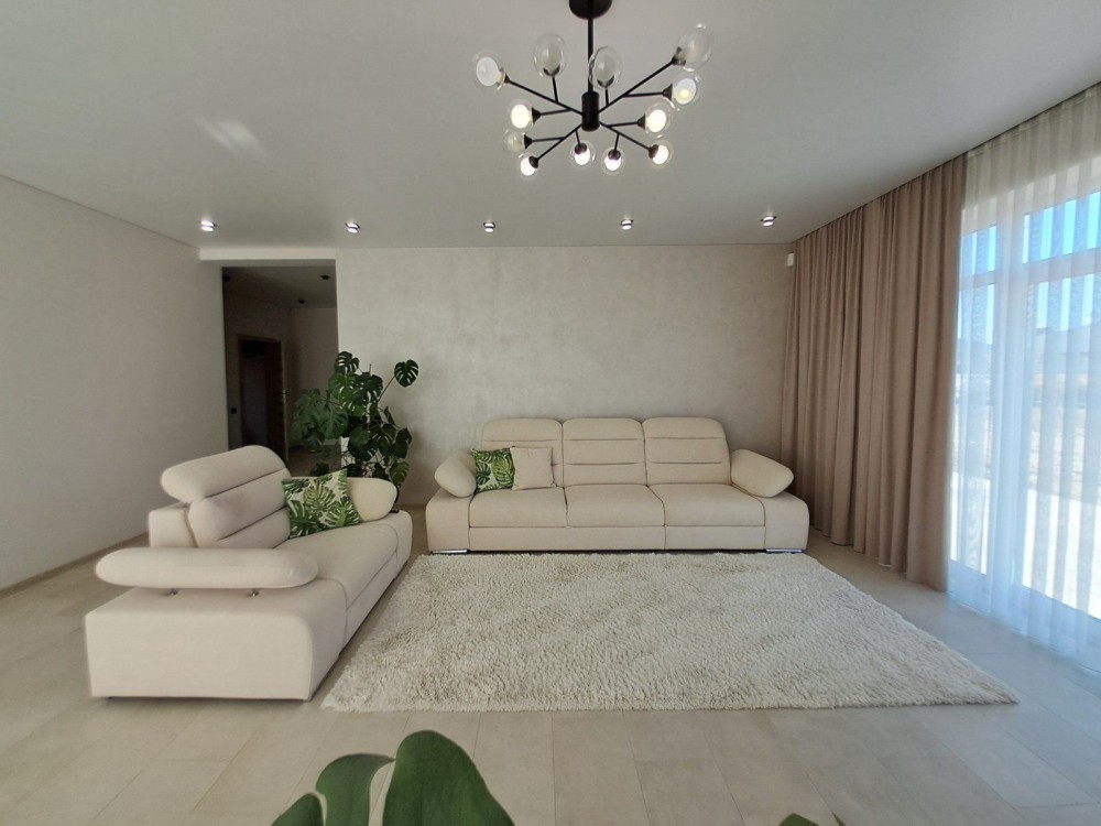 В будинку три спальні, простора вітальня з кухнею і з виходом на терасу, гардеробна, санвузол, ванна кімната, паливна ,гараж.