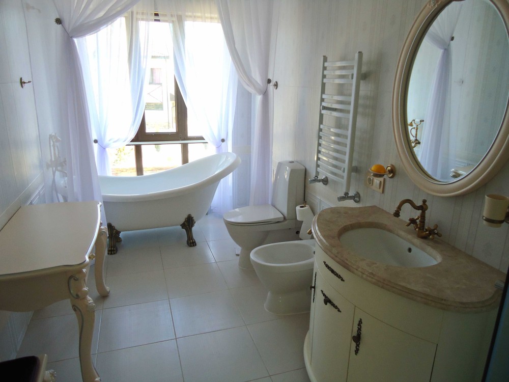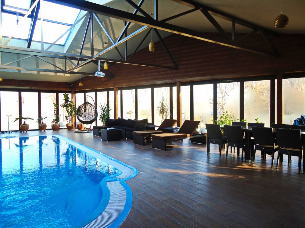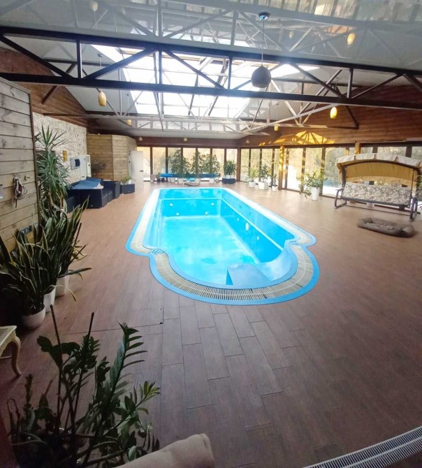 Будинок має сучасну побутову техніку, дизайнерські меблі, сучасну систему кондиціювання. У будинку 4 санвузли обладнано австрійською сантехнікою Лауфен. Критий переливний басейн, у комплексі з турецькою лазнею хамам та зоною відпочинку займає площу 215 кв.м. Розсувна система "Акордеон" дозволяє насолоджуватися відпочинком біля басейну взимку та влітку.