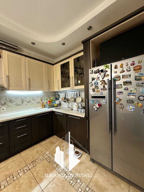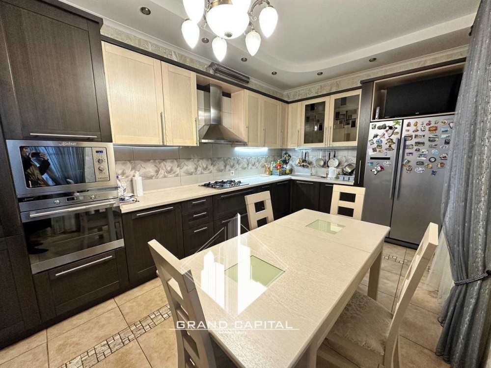 Кухня-їдальня, вся необхідна техніка на кухні: великий двохдверний холодильник, плита газ, посдомийна машина, мікрохвильова піч та духова шафа.