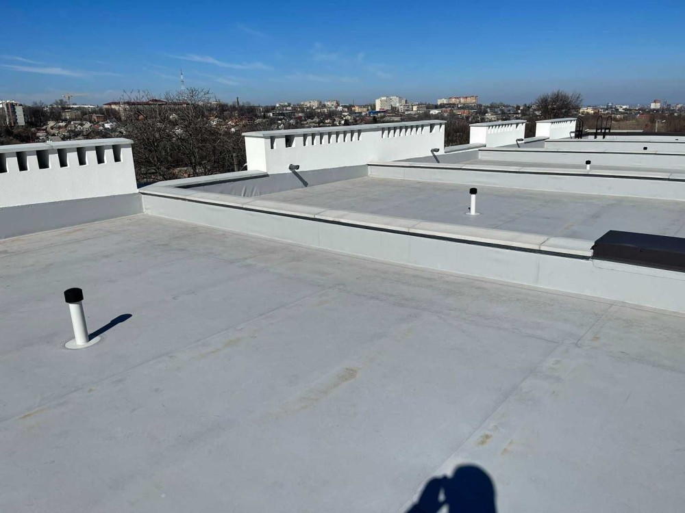 Покрівля плоска, утеплення 250мм екструдера, утеплення парапетів зсередини - 50мм екструдера, зверху мембрана Renolit (Німеччина).