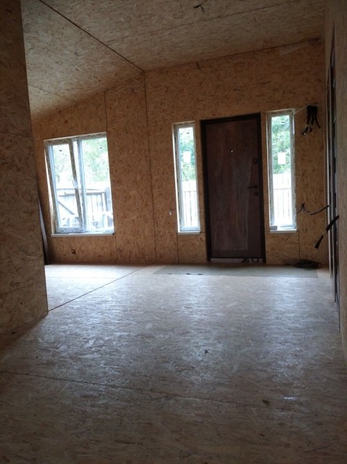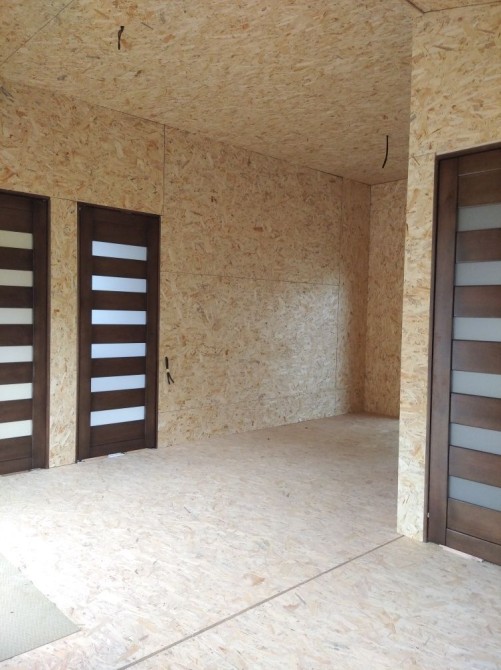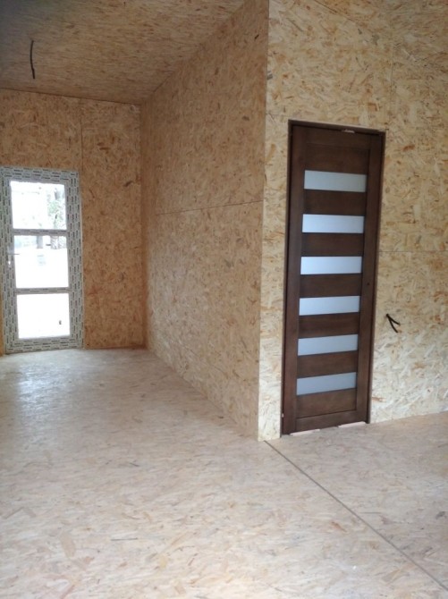 В середині стіни облицьовані ОСБ3 10мм без шпаклівки при потребі нанесемо шпакліку, або прикріпимо гіпсокартон ,або фальш брус з дерева смерека., фанера 12мм.