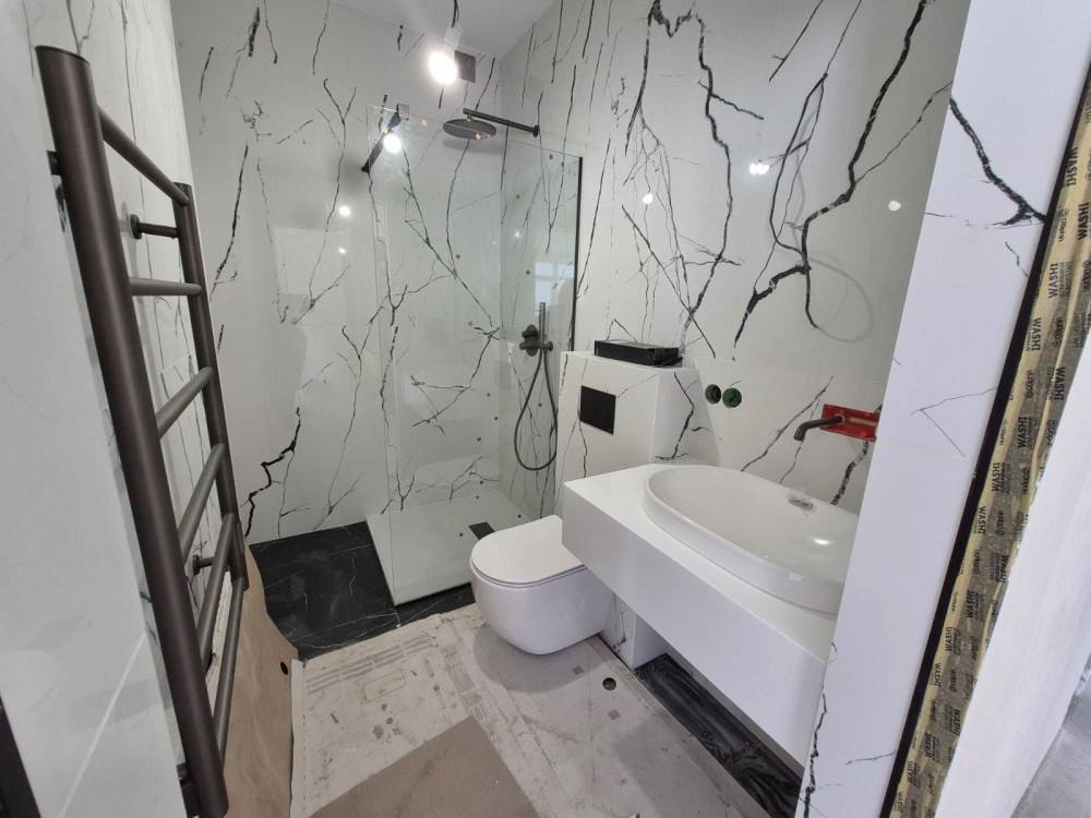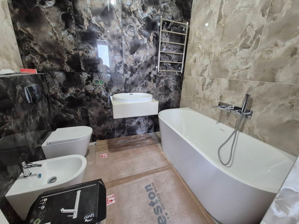 Усередині виконано стильний сучасний ремонт у світлих тонах. Простора кухня-вітальня з вбудованою технікою та меблями , повністю укомплектована ванна кімната з пральною машинкою, унітаз, біде.