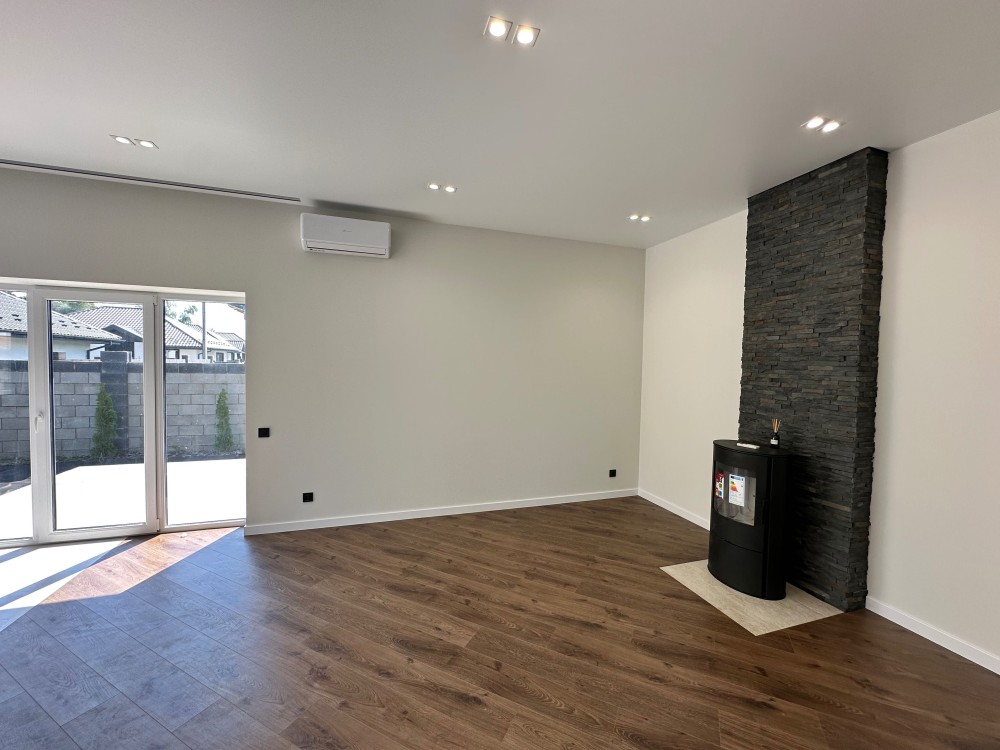 Будинок зведений із газоблоку, утеплений пінопластом 100 мм, дах — металочерепиця з утепленням 200 мм мінеральної вати. Комунікації підключені: газ, електрика, свердловина, септик. У дворі — газон, дерева, бруківка, є місце для трьох авто.