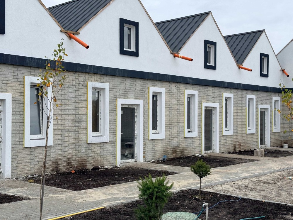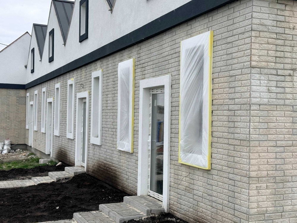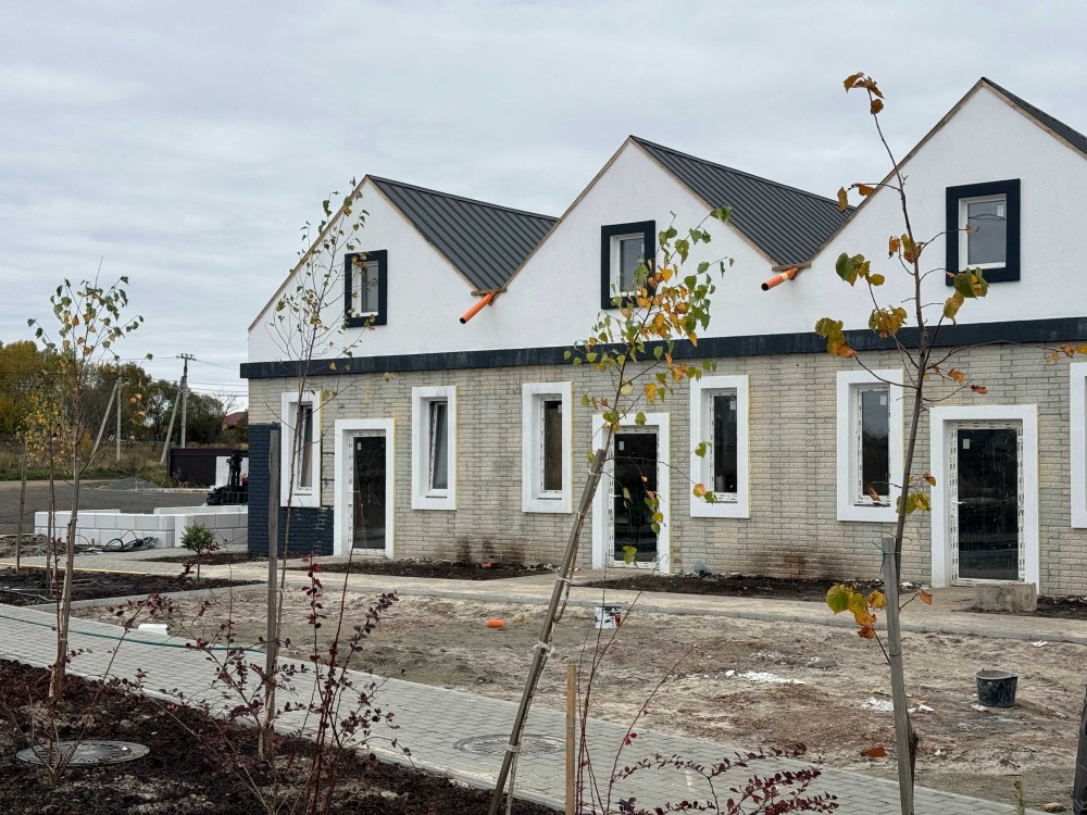 Площа кожного таунхаусу — 33 м², земельна ділянка — 0,5 сотки. Будинки зведені з газоблоку 200 мм, утеплені пінопластом і оздоблені клінкерними панелями. Дах — фальцевий, утеплений мінеральною ватою, вікна Rehau забезпечують тепло й тишу в будь-яку пору року.