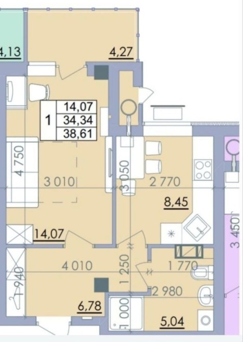 Площа 39 квадратів, кухня 9 кв.м