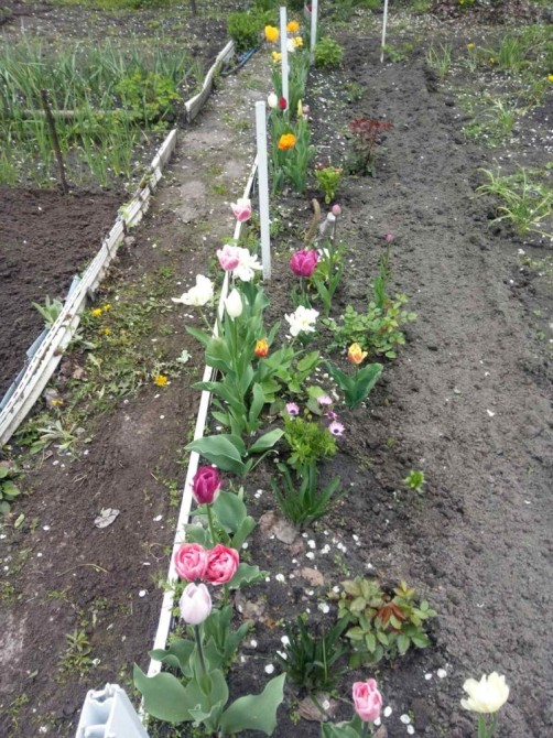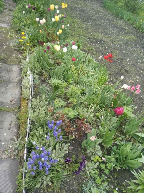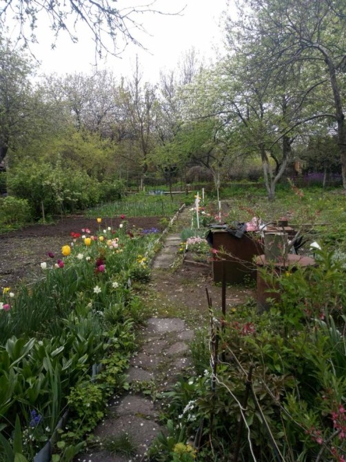 Много цветов, виноград, фруктовые деревья, кусты смородины, кизила.