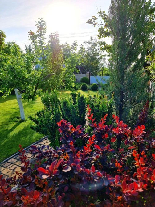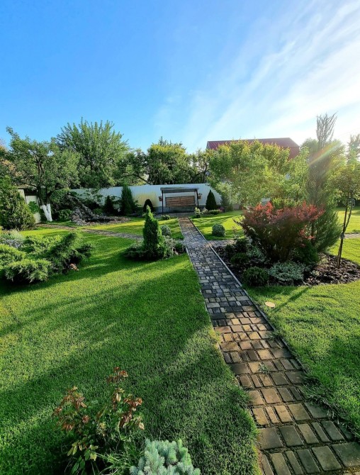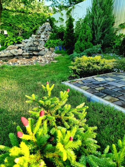 Ландшафтный дизайн, газон и множество зелёных насаждений.