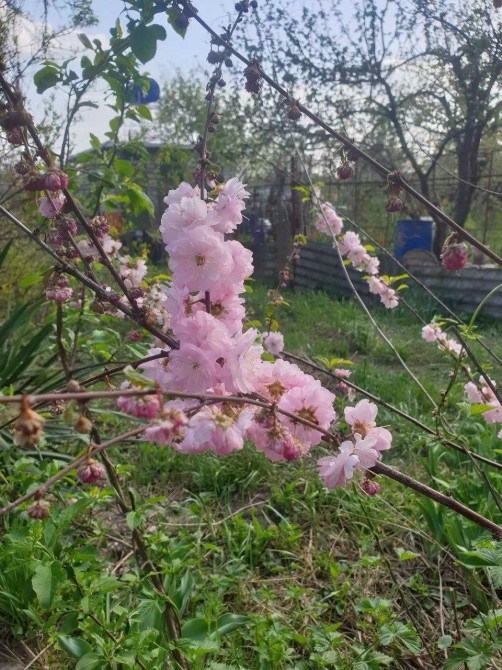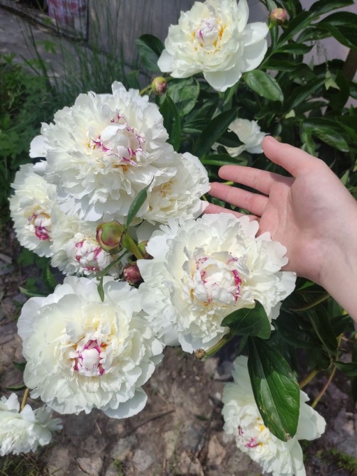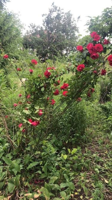 Декоративні дерева та рослини - кущі шипшини (біла та рожева), кущі півоній (махрові білі та рожеві), чайна троядна (червона), тюльпани, садова ромашка.
