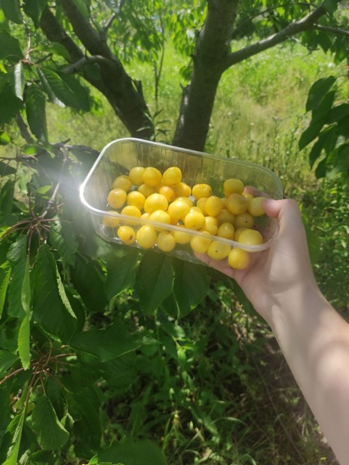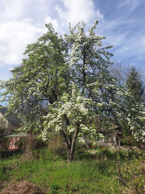 Плодові дерева та рослини - велика груша (2 шт), яблуня (білий налив), вишня, жовта черешня, молодий персик, молодий горіх, столовий виноград, слива.