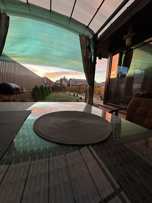 На заднем дворе зона барбекю для отдыха с друзьями с видом на хвойники и декоративные плодовые деревья. Во дворе есть хоз постройки, для чего либо